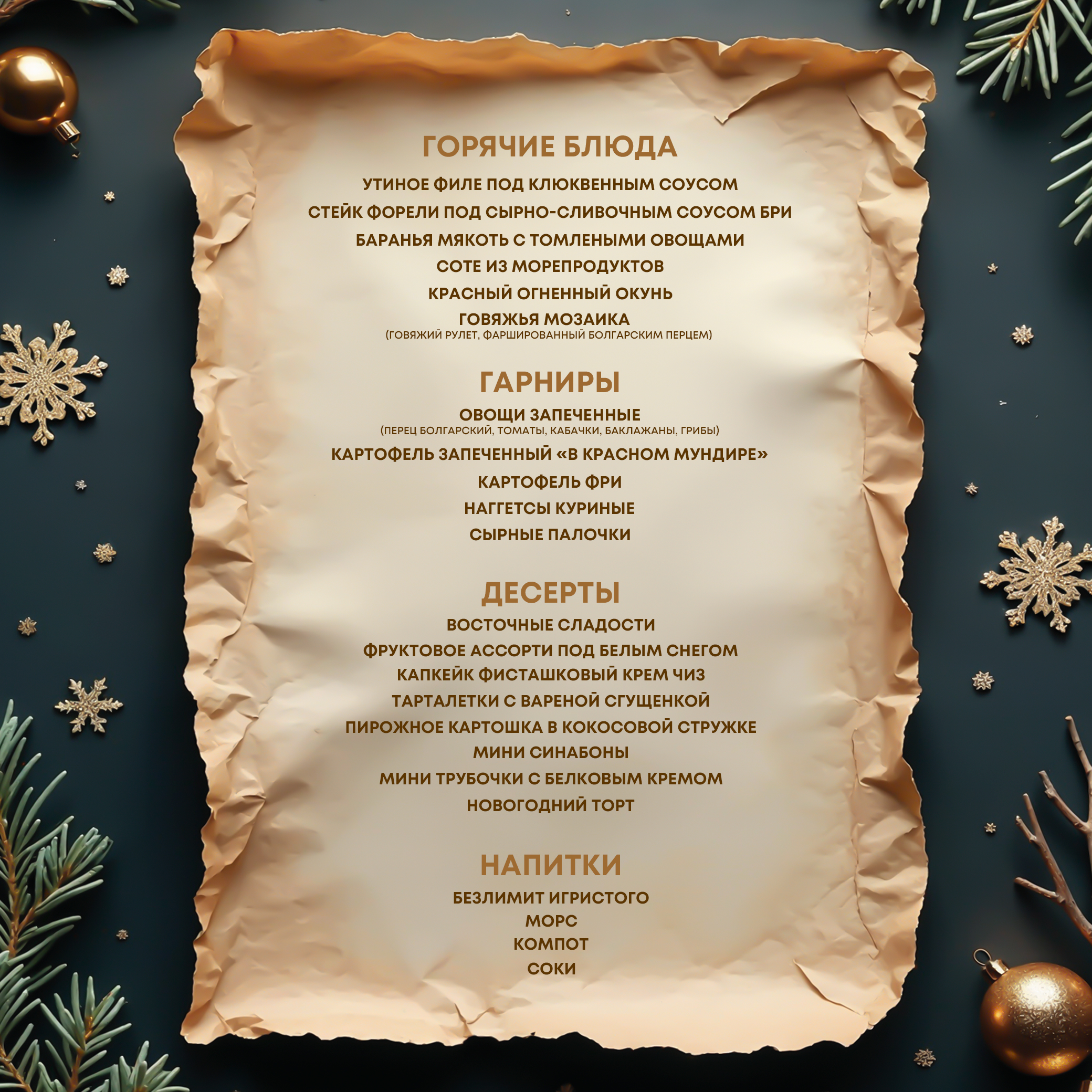- Праздничное угощение — как путешествие по зимней сказке: шведская линия, усыпанная гастрономическими сокровищами — от изысканных деликатесов до уютных, по-домашнему теплых блюд.